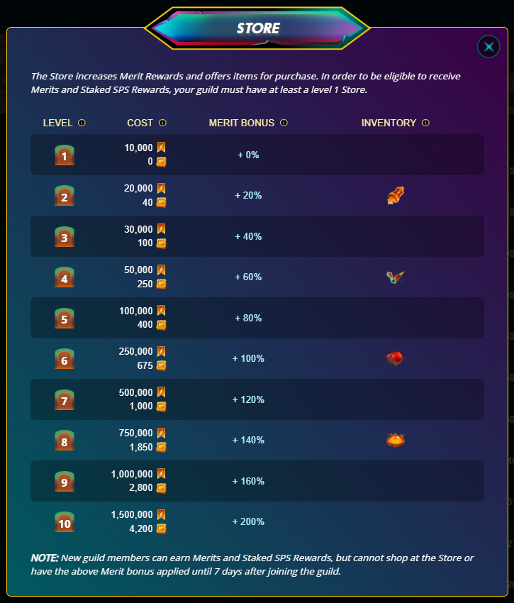 **Merit Bonus:** This shows the percentage of merit bonuses received per store level. Many items in [Splinterlands](https://splinterlands.com/?p=shop\&tab=guild) can only be purchased by merits.