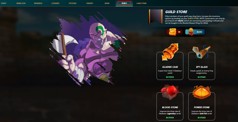 2. **Store items** - Reaching certain levels will unlock new items, which will then be purchasable in the Store. Guilds should strive to reach Store level 2 as quickly as possible, as that unlocks Gladius Cases for purchase.