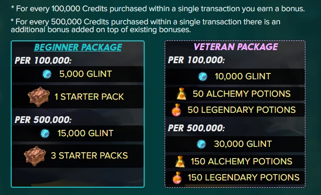 * To help make up for these fees, we have introduced a bonus program where purchases of 100,000 Credits or more will earn in-game rewards. You have a choice of Starter Packs & Glint or Potions & Glint: