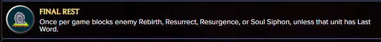 * Final Rest has been changed to only work once per game on an enemy Rebirth, Resurrect, Resurgence, or Soul Siphon - provided the Unit doesn’t have Last Word. This will reset if the Unit with Final Rest is resurrected itself.